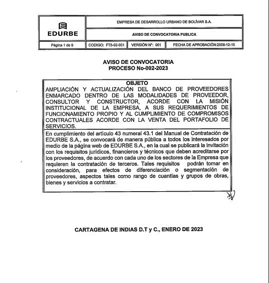 AVISO DE CONVOCATORIA PUBLICA PROCESO No-002-02023